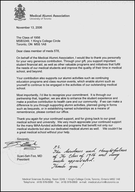 "The accounting is now completed for the 5T6 reunion. After all expenses were paid we had $2,013. left. As agreed upon unanimously by the organizing committee we donated $2,000. to the Medical Alumni Association. We have received a letter of thanks (below).